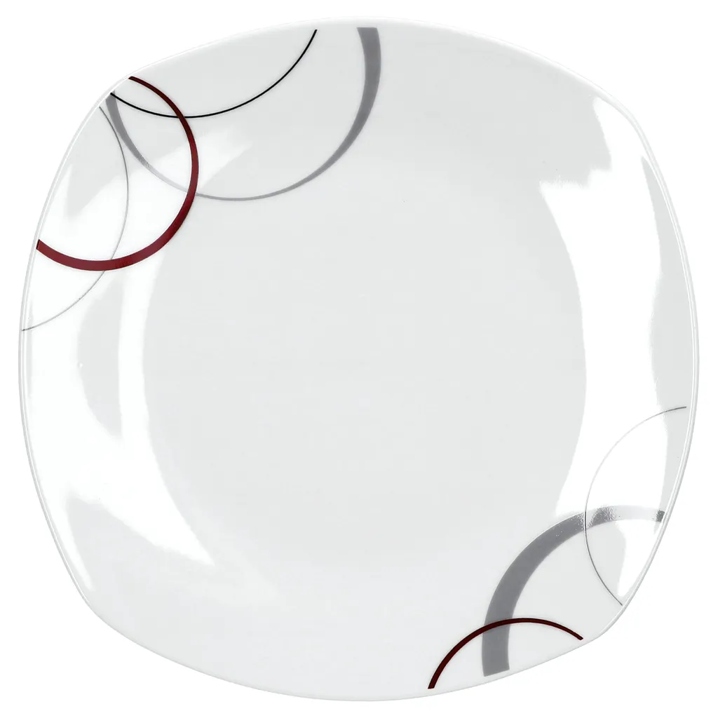 Frühstücksset Palazzo 12tlg. – 6 Teller á 19cm Und 6 Becher á 33cl Aus Weißem Porzellan MitNachbildung-Kreisen In Grau Und Dunkelrot – Für 6 Personen