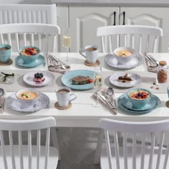 Tafelservice Steingut, Vancasso VINE Ess Geschirrset, 32-teiliges Kombiservice Mit Je 8 Speisetellern, Kuchentellern, Schalen Und Tassen Für 8 Personen, Geprägte Liane